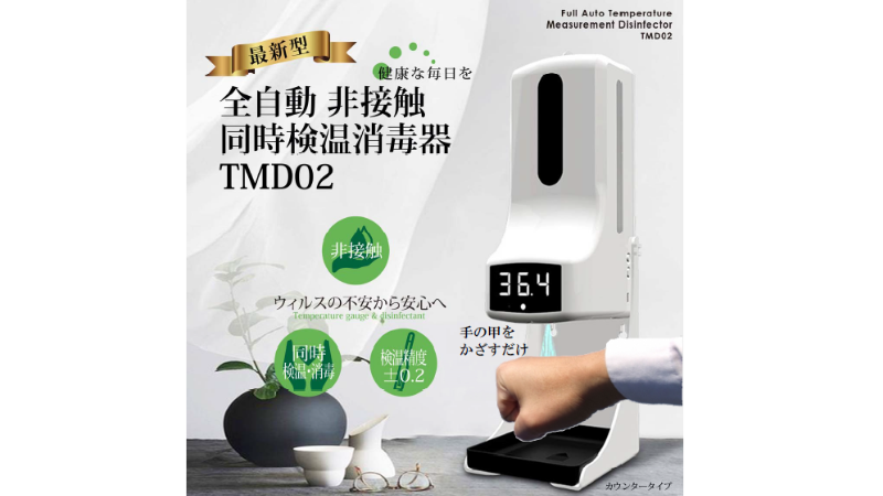 ・手肌に優しく、2倍に希釈した水成二酸化塩素®を手指消毒として使用が可能ですので、弊社取り扱いの全自動非接触同時検温消毒器(TMD02)も購入をお勧めします。
