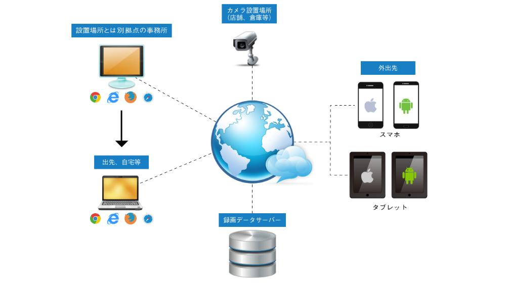 自環境に設置した録画HDDレコーダー等では、ネットワーク的に離れた地点にある複数のカメラを一括で管理することは困難です。