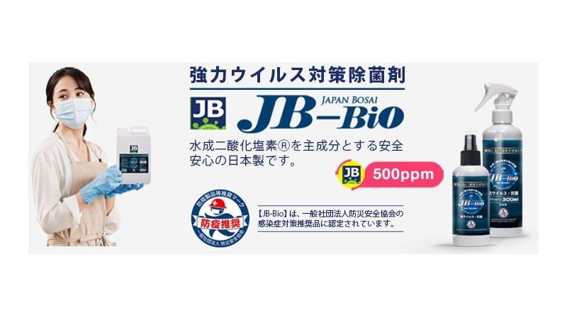 人体に存在する成分のみで作られた安心・安全な除菌剤「 JB-Bio (水成二酸化塩素®)」を使用した、空間除菌プランです。(米国バイオサイド・インターナショナル社が特許製造、販売)
